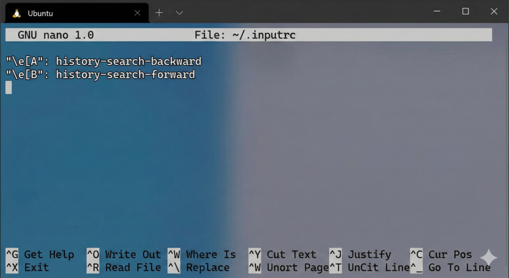 Save (Ctrl+O, Enter, Ctrl+X). Reload: bind -f ~/.inputrc.